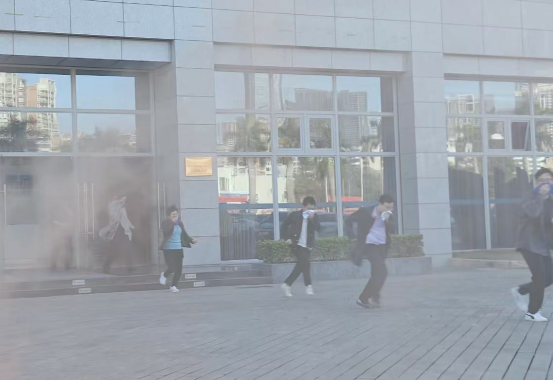 “報告!三樓發(fā)現(xiàn)火災警報!”按照演練方案,工作人員在市水務調(diào)度中心三樓“發(fā)現(xiàn)”火情,并按下消防報警按鈕。隨后消防控制室工作人員向演練指揮組長報告火情,啟動市水務調(diào)度中心大樓消防應急預案。消防控制室立即拉響大樓消防警報,滅火消防小組火速趕往起火點進行滅火。與此同時,在濃烈的煙霧和刺耳的警報聲中,各樓層員工迅速從樓梯有序疏散至一樓空曠地方。
